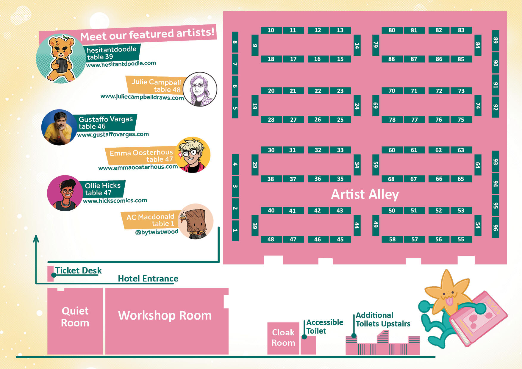 Sequential Scotland is taking place on the 02/08/2025 at the DoubleTree by Hilton, Cambridge Street, Glasgow, G2 3HN, and will be open to the public from 10am – 5pm. Exhibitor set up will be from 9am – 10am, and takedown will be 5pm – 6pm.Exhibitors are prohibited from attaching things to the venue walls. Backing boards are not available, and you are not permitted to bring your own. Please ensure your table is presentable, and that none of your stock or equipment is blocking the aisle or your fellow exhibitors. We will not be providing table cloths so please bring your own. Please refrain from plugging any devices into any sockets. It is your responsibility to ensure that you have your own up to date public liability insurance – stallholder public liability insurance can be bought by the day, or comes with membership to the a-n (https://www.a-n.co.uk/).18+ content is permitted at Sequential Scotland, however please ensure that all displayed work is appropriate for viewing by a general audience – either by keeping 18+ work under the table or censoring it appropriately. Sequential Scotland reserves the right to ask you to either remove inappropriate work from your table, ask that you censor the work more thoroughly, or more clearly signpost that the intended audience is 18+.Artists found to be exhibiting, selling or promoting illegal material will be asked to leave and banned from future conventions.Fan works are permitted, but please keep it to a maximum of 10% of the work you have on your table.Exhibitor Behaviour